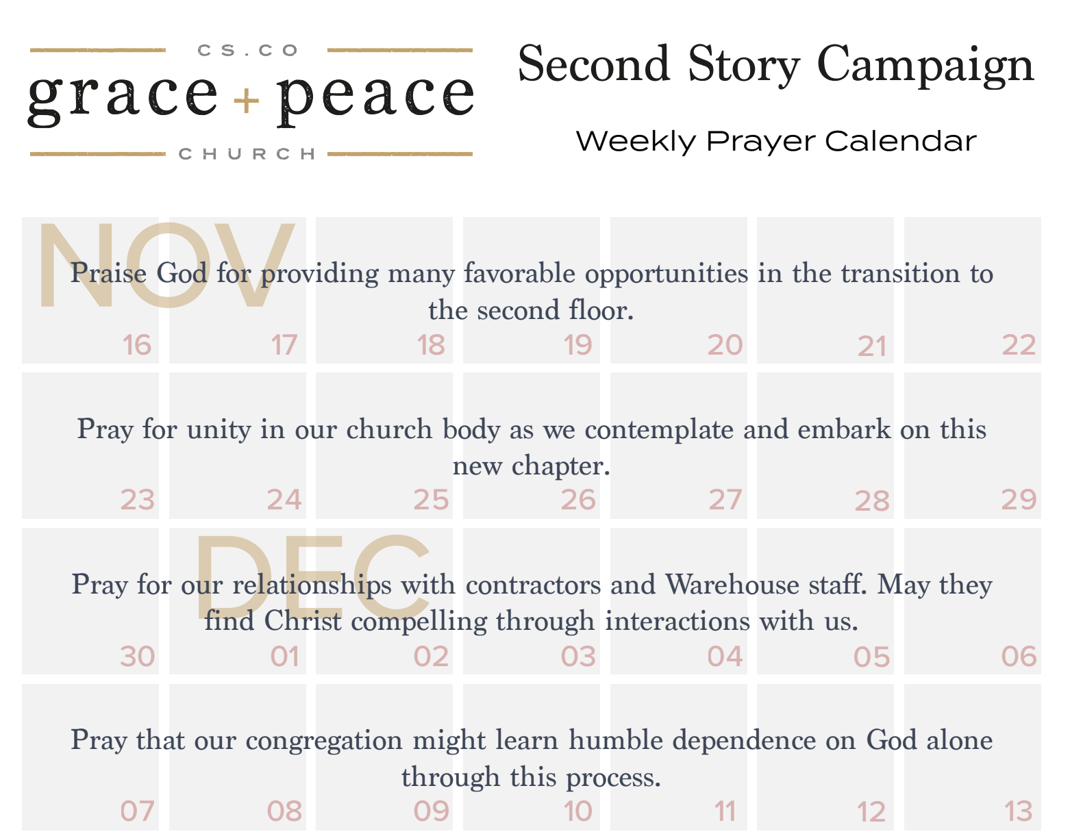 We covet your prayers and support as we seek to steward the resources God entrusts to our church body faithfully. Download our 20-week prayer calendar to remind yourself that we are wholly dependent on God for every step of this process.